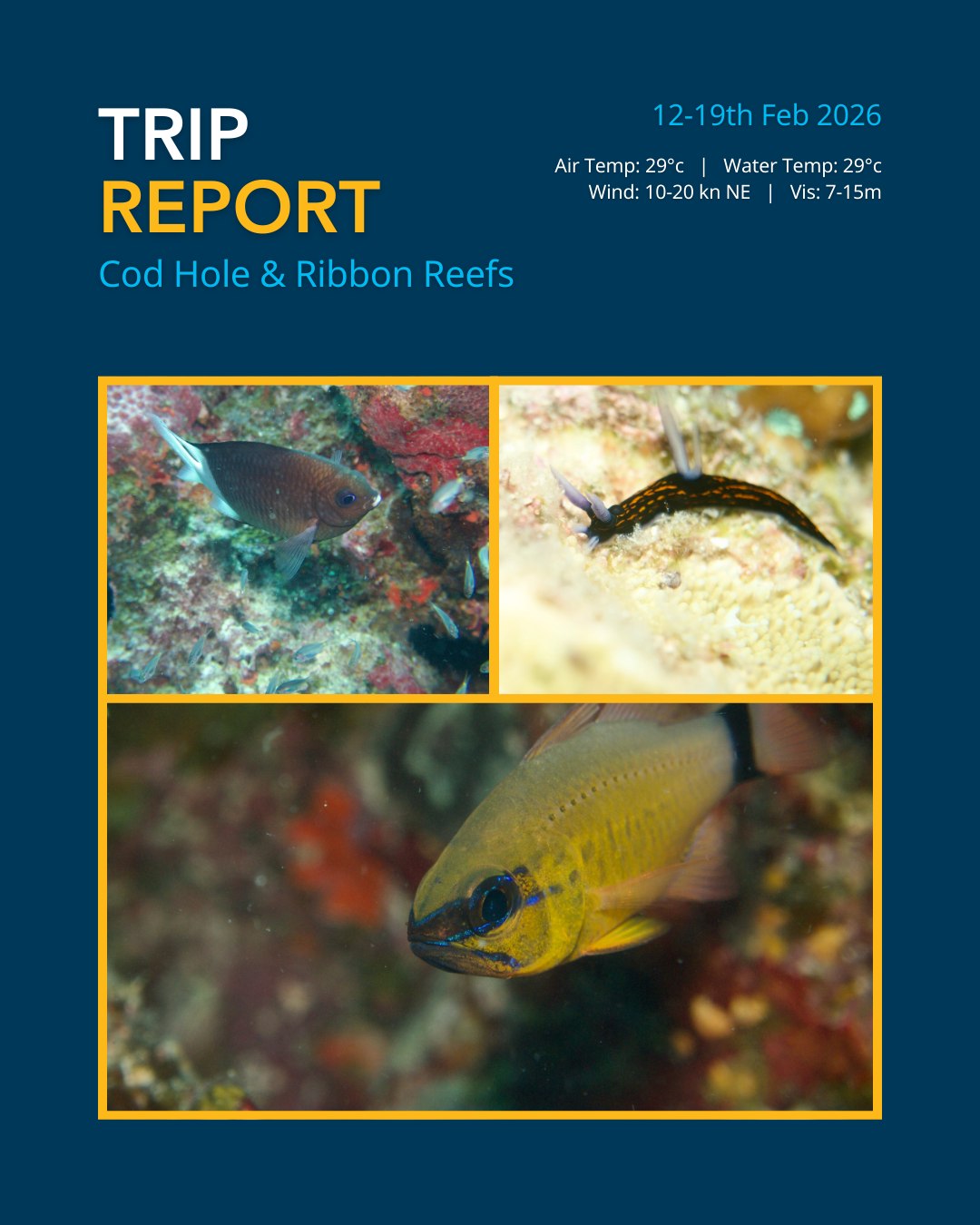 This expedition was defined by strong marine life interactions across the northern Ribbon Reefs. Our flexible itinerary ensured we made the most of the prevailing northerly winds to access key sites in comfort. We opened the trip at Saxon Reef, where divers were immediately greeted by four turtles gathered around a cleaning station. Heading north, Ribbon Reefs 9 and 10 delivered classic biodiversity, featuring our resident Potato Cod, a lingering leopard shark, and several tawny nurse sharks. We also took the opportunity to conduct some exploratory dives on the ‘Wild Side’ of the Ribbons, identifying bumphead parrotfish and spotting rare epaulette sharks on our night dives. The voyage concluded with an impressive species list and a special honeymoon celebration for guests on board.