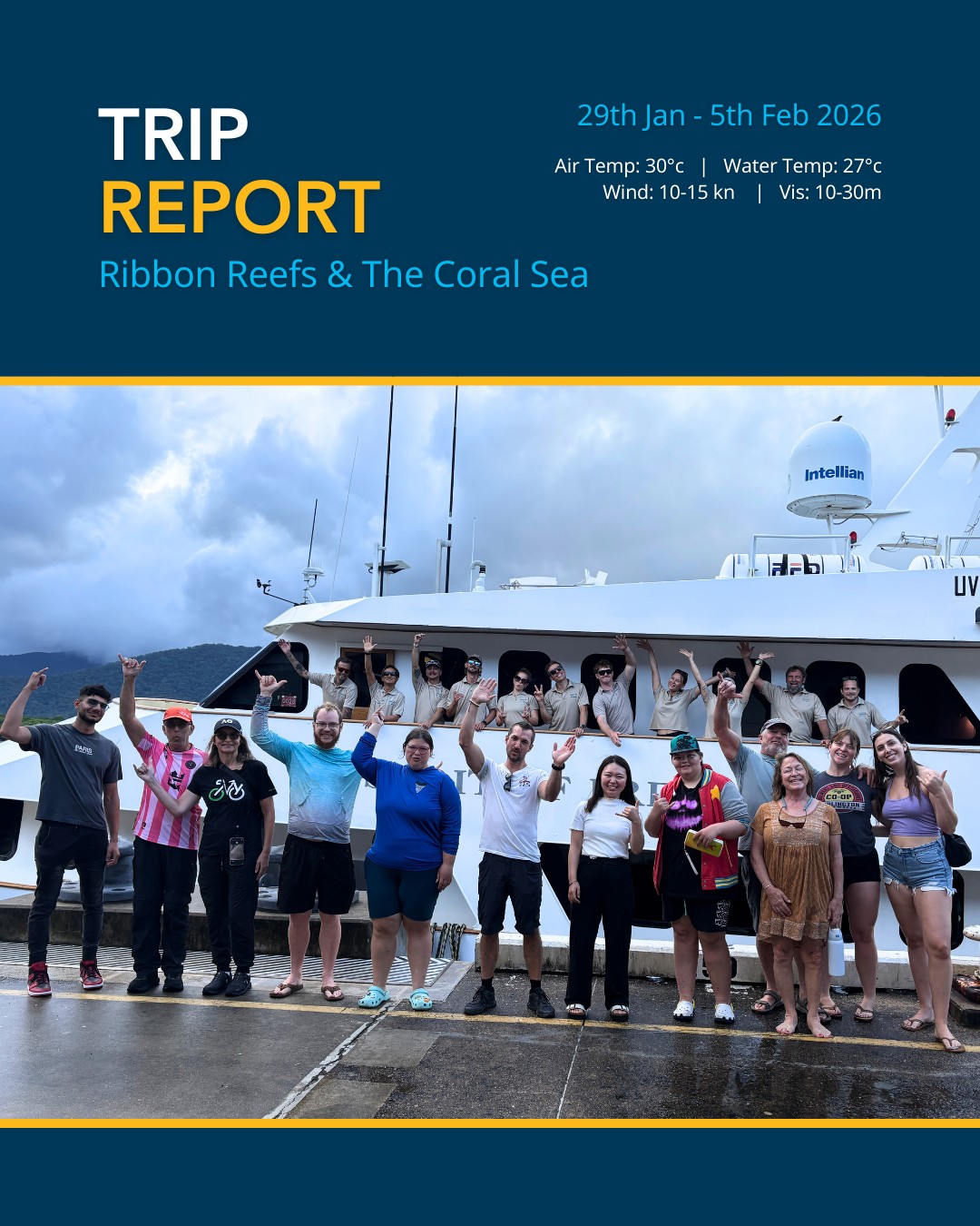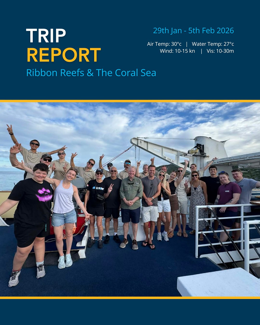 With water temperatures hovering around 28°C to 29°C, February is a time of intense energy on the reef. It is a busy season for marine life, with turtle nesting activity continuing and large pelagics hunting along the drop-offs. This month delivered spectacular visibility out wide, exceeding 50 metres at our premier sites. Our expeditions recorded very special encounters, including a rare melanistic manta ray, pilot whales, hammerhead sharks, and numerous certifications and milestone celebrations on board.